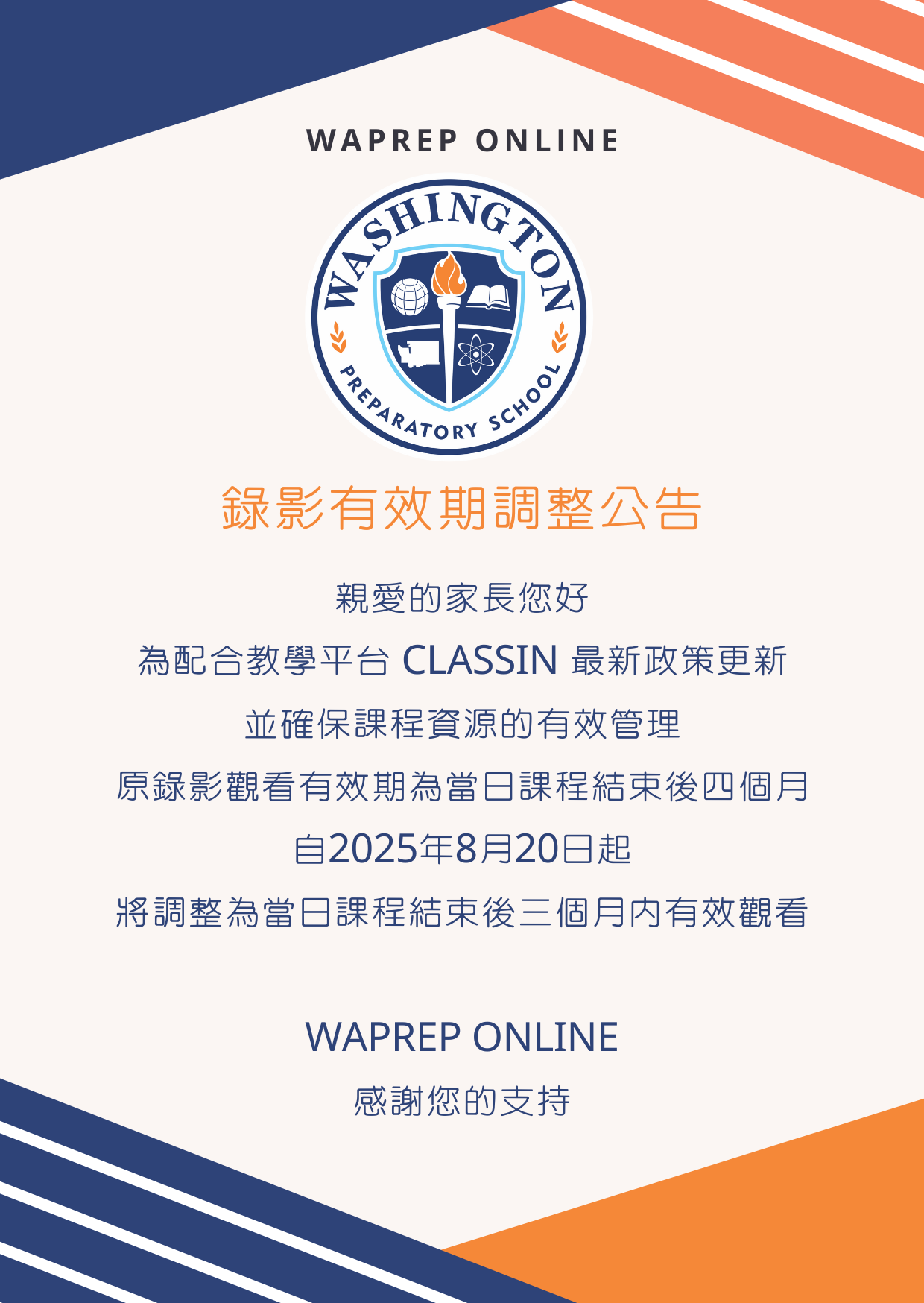 為因應教學平台 CLASSIN 最新政策規定,並配合本校課程資源管理政策的優化與落實,自2025年8月20日起,我們將對課程錄影的觀看效期進行以下調整:
